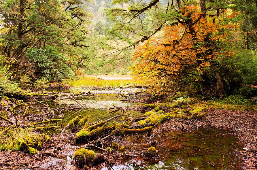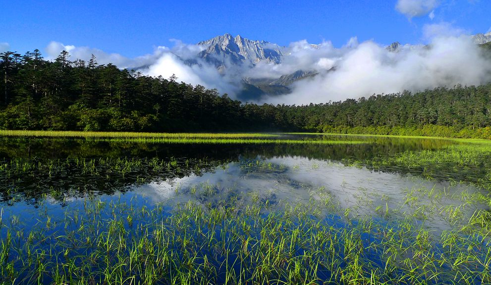 说起海螺沟的草海子,那可是鼎鼎大名!草海子在原始森林的入口处,草位于山地暖温带针阔叶混交林带,海拔2850米,水域面积近5000平方米,是一处末次冰期古冰碛湖,湖中长有1—2米高的豆腐草,四周围绕的是苍龙翠绿的原始乔木。眺望草海,真的恬静如画。
