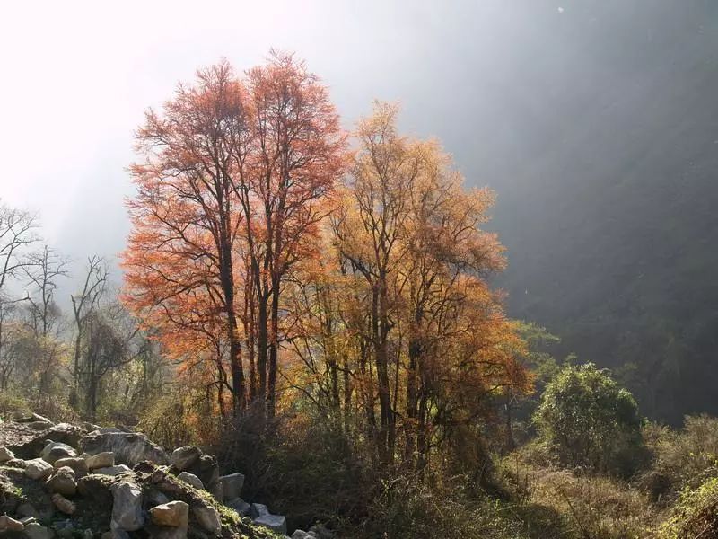 在海螺沟茂密的原始森林中,生长着一种落叶高大乔木---连香树。它是一种古老稀有的珍贵植物,分布在景区内一号营地。每当春意盎然之时,山间的树木都绿了,唯连香树以一抹红色独竖其中,显得格外娇艳动人。