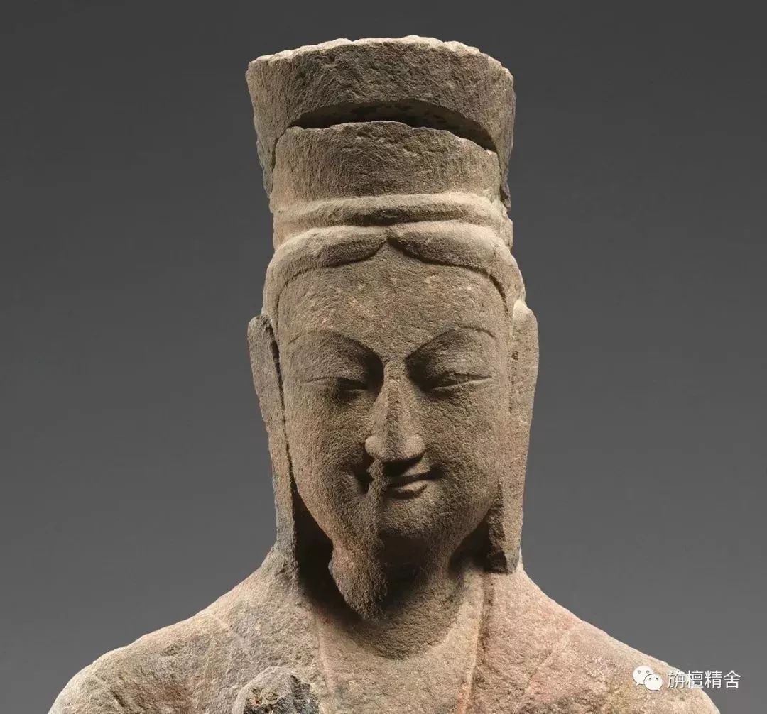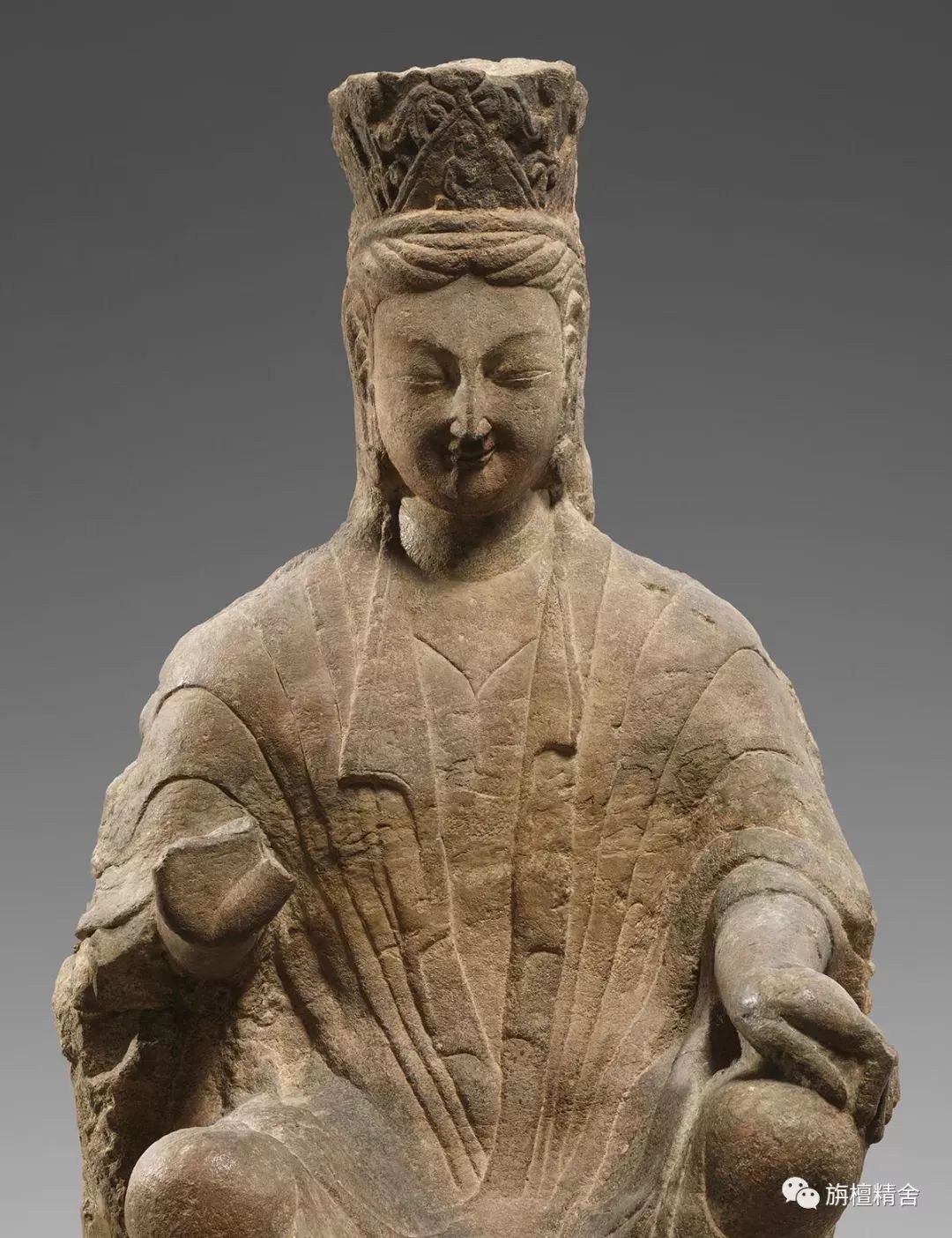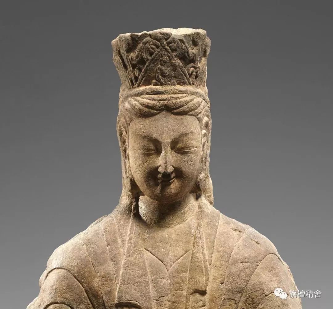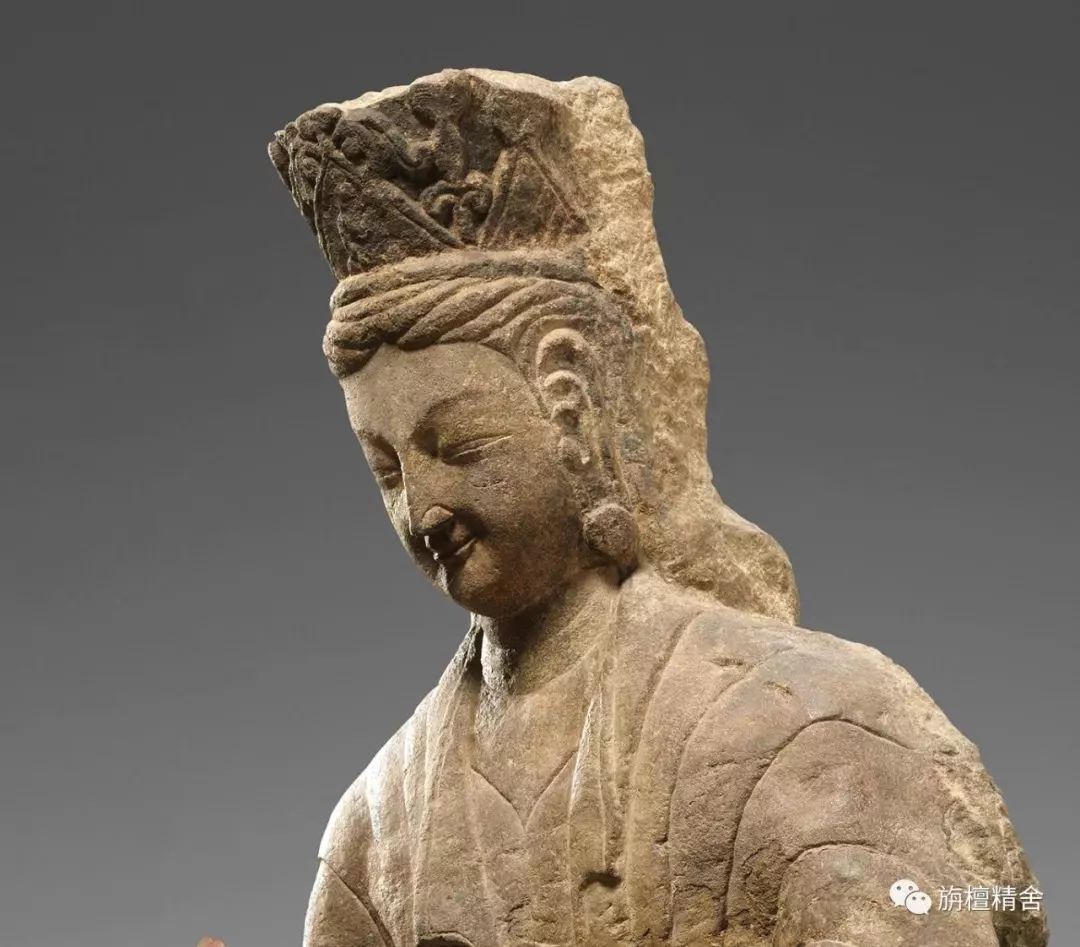 美国大都会艺术博物馆收藏的这尊交脚菩萨石雕像,制作年代为公元480-490年之间,距今已有1500多年的历史。交脚观音菩萨头戴宝冠,冠中有小化佛。面呈微笑,弯眉细目,直鼻小口,目微闭而含情,俯视着芸芸众生,似乎随时准备闻世间疾苦之声而前往救助。菩萨肩披披帛,下着贴体长裙,衣饰线纹流畅,手法简洁。右手似施无畏印(缺损),左手自然下垂抚膝,双腿交叉而坐。神情自若,姿态典雅端庄。整体比例精当匀称,舒展大气,给人以回味不尽的美感。