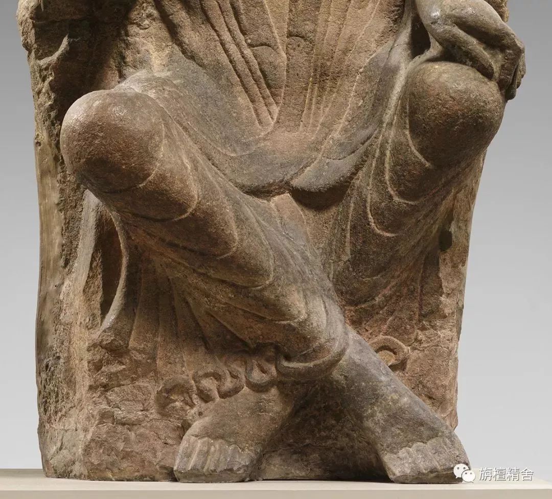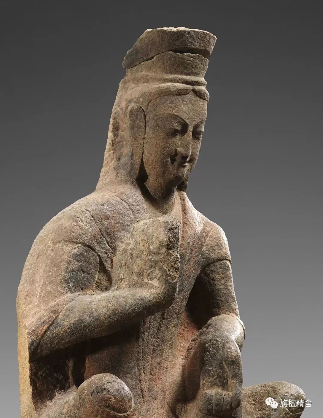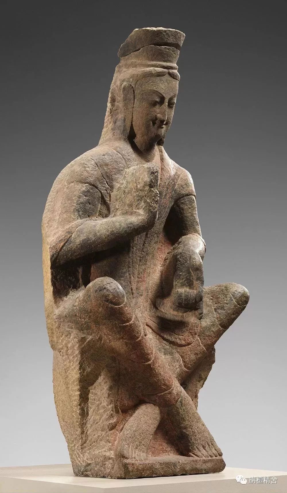 美国大都会艺术博物馆收藏的这尊交脚菩萨石雕像,制作年代为公元480-490年之间,距今已有1500多年的历史。交脚观音菩萨头戴宝冠,冠中有小化佛。面呈微笑,弯眉细目,直鼻小口,目微闭而含情,俯视着芸芸众生,似乎随时准备闻世间疾苦之声而前往救助。菩萨肩披披帛,下着贴体长裙,衣饰线纹流畅,手法简洁。右手似施无畏印(缺损),左手自然下垂抚膝,双腿交叉而坐。神情自若,姿态典雅端庄。整体比例精当匀称,舒展大气,给人以回味不尽的美感。