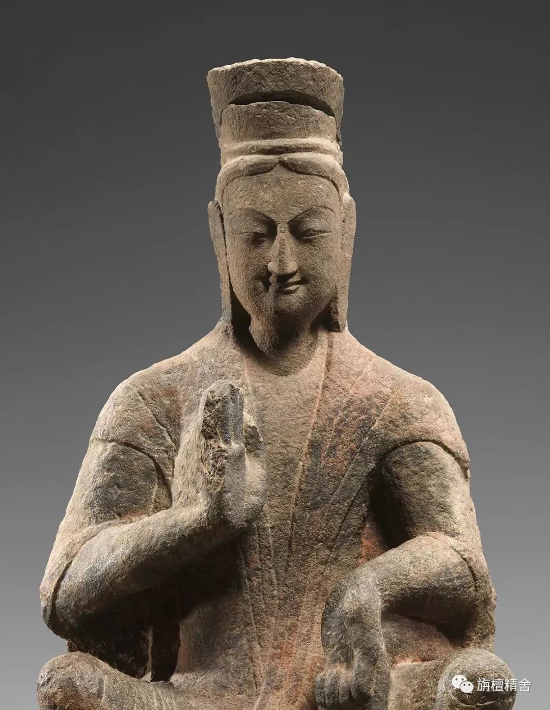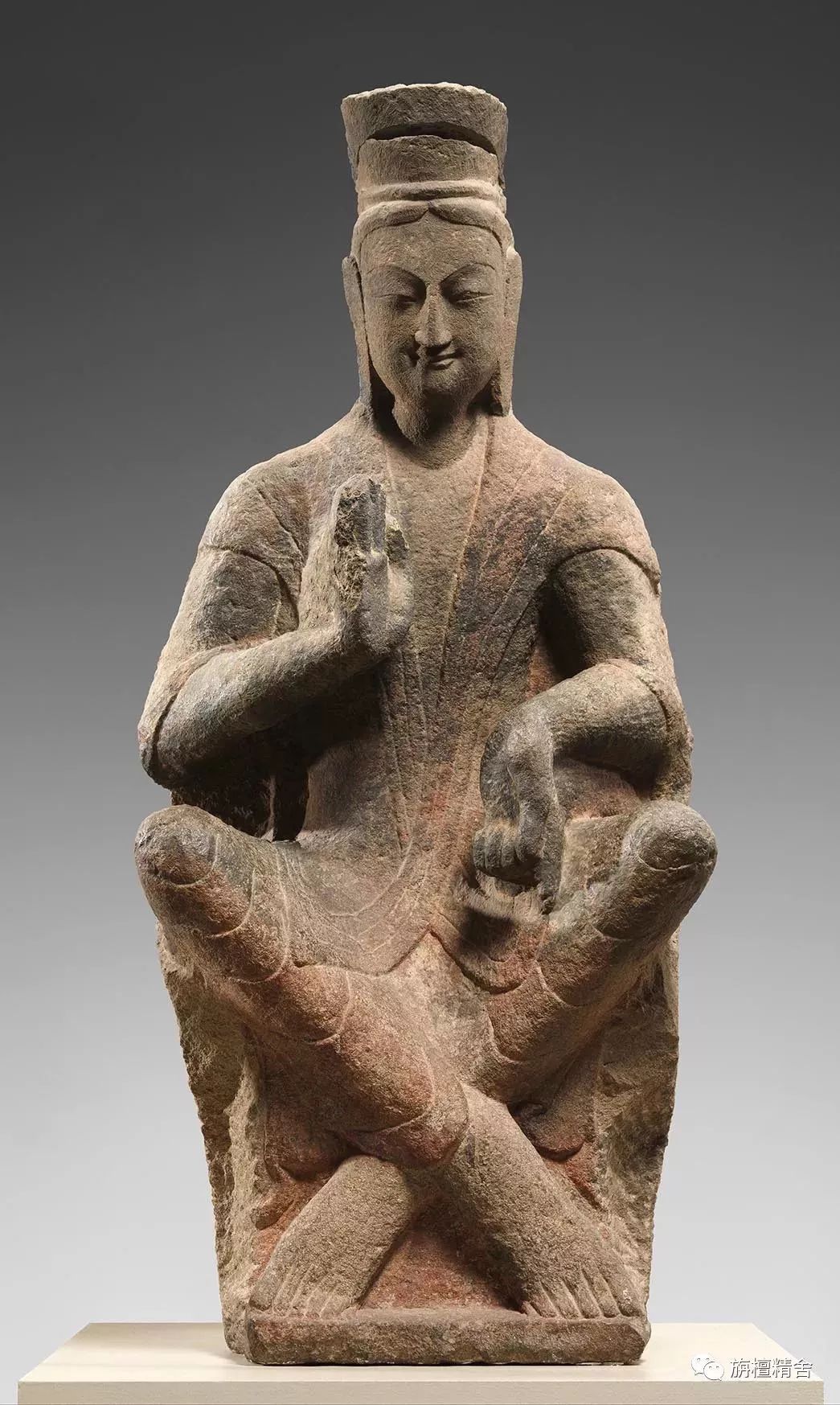 美国大都会艺术博物馆收藏的这尊交脚菩萨石雕像,制作年代为公元480-490年之间,距今已有1500多年的历史。菩萨头戴宝冠,面呈微笑,法相端庄慈祥。右手呈施无畏印,左手结与愿印。肩披披帛,体躯比例合度,衣饰线纹流畅完美,而且手法简洁。坐像高达1.3米,保存非常完好,是难得一见的北魏造像艺术珍品。