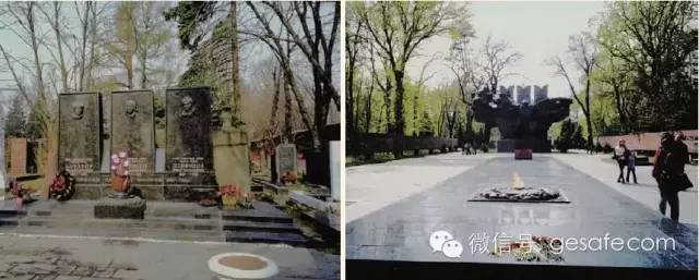 图14 “俄罗斯虽大,但是我们已经无路可退,后面就是莫斯科。”这句卫国战争中广为传诵的名言,来自参加莫斯科保卫战的苏军316步兵师。1941年10月,潘菲洛夫率领在中亚哈萨克斯坦编成的316步兵师投入莫斯科保卫战,英勇无畏,功勋卓着。该师28名勇士挡住了德军50辆坦克4小时的轮番攻击,全部牺牲。11月17日,316师被命名为红旗近卫第8步兵师。次日,师长潘菲洛夫阵亡。左图是作者摄于莫斯科新圣女公墓的潘菲洛夫将军墓。右图为作者摄于哈萨克斯坦阿拉木图的潘菲洛夫-28勇士纪念公园。
