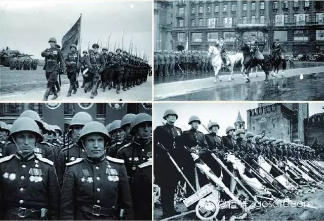 图17 1945年6月24日,为庆祝卫国战争的胜利,苏联在莫斯科举行了盛大的胜利阅兵式。阅兵式由朱可夫元帅担任首长,罗科索夫斯基元帅任总指挥。10时整,阅兵式开始。在1400人联合军乐团奏响《光荣啊,俄罗斯人民》以后,由叶戈罗夫中士和坎塔里亚下士插上柏林国会大厦楼顶的白俄罗斯第1方面军第3突击集团军第150步兵师的战旗首先通过红场。随后是10个方面军选送的官兵分别组建的阅兵式混成团,这些九死一生、战功卓着的官兵,在方面军司令员的率领下,身着胜利礼服,佩戴全部勋章,高举部队战旗,依次通过红场。最后,200名仪仗兵把缴获的200面德军军旗抛在列宁墓前,再现了1812年将拿破仑的军旗抛在沙皇亚历山大一世脚下的一幕。左上图为莫斯科卫戍部队举行仪式,迎接各部队的战旗。右上图为朱可夫元帅在罗科索夫斯基元帅陪同下,骑马跃出斯帕斯基门。左下图为全部由获得金星勋章的苏联英雄组成的方队。右下图为倒持德军军旗的苏军仪仗兵。