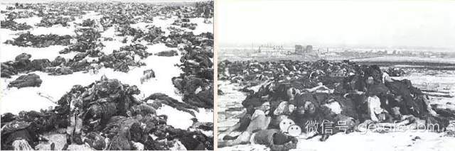 图2 在残酷的斯大林格勒战役中,苏德双方尸横遍野。左图为红十月炼钢厂和伏尔加河之间的苏军遗体,右图为德军第六集团军官兵的遗体。投入斯大林格勒战役的是德军最精锐的部队之一,苏军坚守斯大林格勒的62集团军司令崔可夫将军就发现,其中的德军第79步兵师几乎全部由二十到二十七岁的青年组成,都号称有纯正的雅利安血统,五分之一是纳粹党员。但是,这些德国的精壮男子基本上葬身于俄罗斯的原野之中。第六集团军的德军官兵战死和冻死147000人,被俘时剩91000人,到战俘营的第一个春天只活下来一半,战后回到德国的只有5000人。