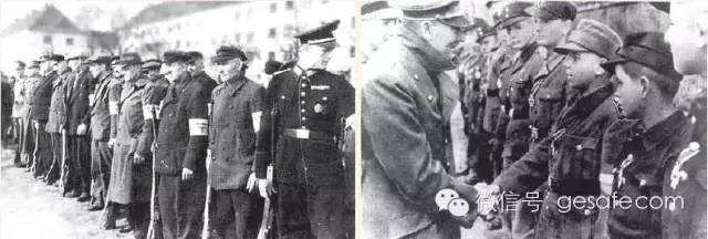 图3 1945年,德国的人力资源已经枯竭。左图为德国在战争后期组建的民兵组织人民冲锋队的士兵。他们多已年过半百,装备和训练都很差,很快就淹没在苏军的钢铁洪流之中。右图为1945年4月20日,希特勒走出地堡,为击毁苏军坦克的少年兵授勋。这是希特勒最后的照片。柏林战役期间,德国帝国青年局长阿克斯曼向第56装甲军军长魏德林将军建议,把数千名12到16周岁的孩子送到前线阻击苏联坦克。魏德林将军大怒:“您不能让这些孩子为一场必输无疑的战斗去送死!”此事遂罢。