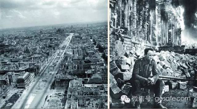 图16 1945年5月的柏林。在战争的最后时刻,德国最高统帅部发出了停战通告。通告写道:“德国海,陆,空三军所做出的贡献和牺牲使我们的敌人都不得不感到敬佩。每一个士兵可以以此自豪而无愧的放下武器,在我们历史上最艰难的时刻,为我们人民的万代幸福,勇敢而自信的去从事工作。 / 在这艰难的时刻,国防军怀念在前线阵亡的战士。面对满目疮痍,血流遍地的祖国,死者尽到了他们的职责。/ 柏林上空的硝烟散尽,是从没有过的宁静。和平万岁!”