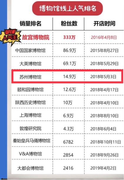 据刚刚出炉的《2018年天猫博物馆文创数据报告》显示,苏州博物馆粉丝数即将15万,与中国故宫、大英博物馆等相差非常大。故宫作为最早进行文创探索的全国超级IP,以及一直被人称为标杆的大英博物馆,不管是在影响力范围还是资源上,苏州博物馆都是不能相匹敌的。
