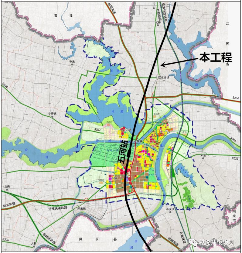 出站后线路继续南行,跨新汴河、G104 国道、徐明高速公路、S304 省道、怀洪新河等至五河县西侧,在徐明高速公路西侧设五河站;