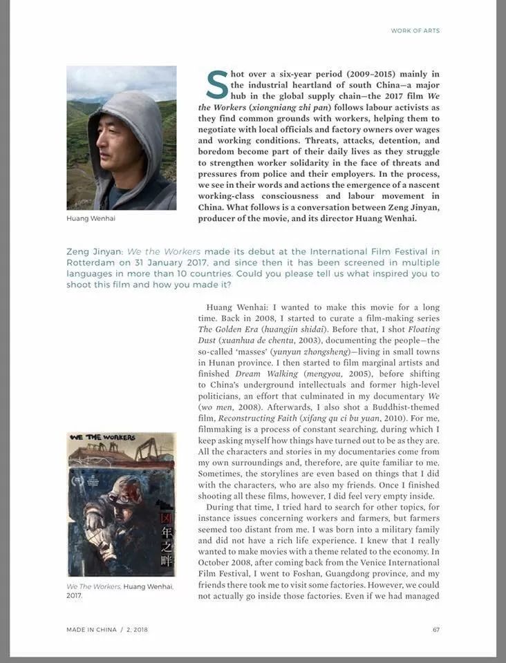 ⾦燕:今天主要想谈新⽚《凶年之畔》(We the Workers)。此⽚2017年1⽉31⽇在⿅特丹国际电影节上世界⾸映,⼀年內在⼗多个国家的电影节、博物馆、⼤学研究机构播映了英语、法语、意⼤利语、⻄班⽛语、中⽂等版本。闻海,你要不要先讲⼀下,怎么会有想法做这个⽚⼦,以及创作的简单经过。
