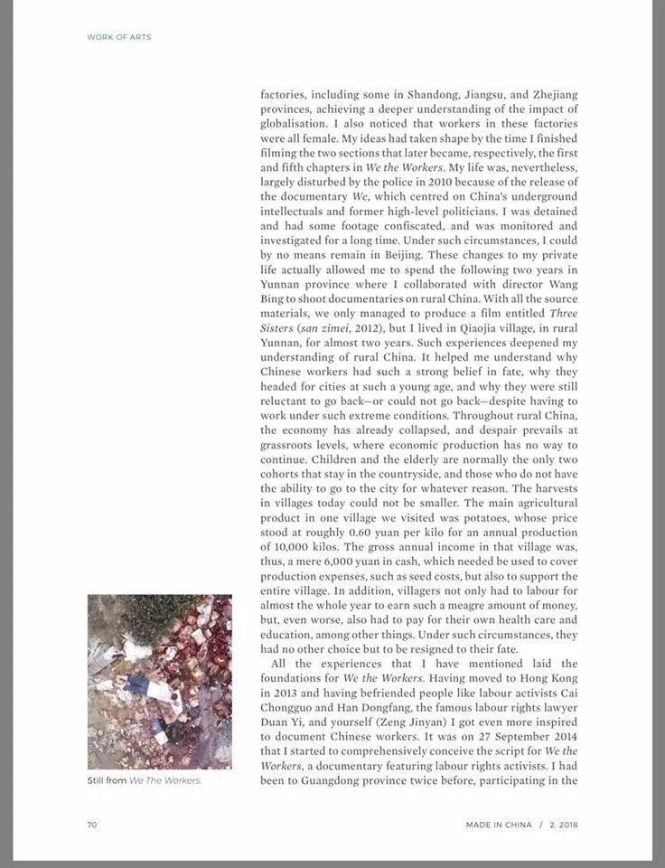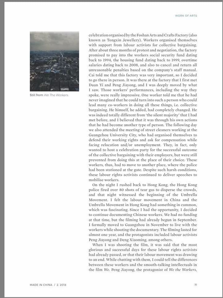 这些经历都是为了现在这部⽚⼦《凶年之畔》做前期铺垫。2013年我移居来⾹港,跟崇国、东⽅、⾦燕以及中国知名的律师段毅认识了以后,对⼯⼈的议题就越发有了想法。第⼀次我完整构思《凶年之畔》,选择以⼯⼈活跃分⼦为议题,就是2014年的9⽉27⽇。在此之前,我去过两次广东,参加佛⼭⼯艺总厂的庆功宴。崇国跟我说这个⼯厂很重要,所以我就去了现场,那是我第⼀次见到段毅和家勇,那个场⾯真的让我特別感动。那些⼯⼈当时的状态,包括他们说话的语气,有位⼯⼈说他从来没想到⾃⼰会成为这样的⼈,能号召很多⼈都跟著⾃⼰做这样的事情(集体谈判)。