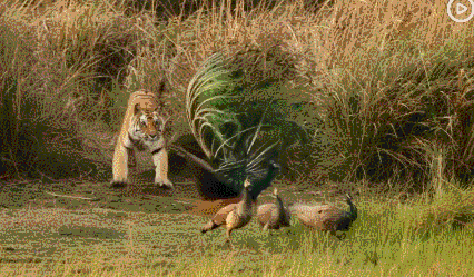 作为一种陆禽,蓝孔雀更习惯用脚走路而不是展翅飞翔,但这并不代表它就不擅长飞行,夜里它们会飞到高树上休息以躲避捕食者。如果威胁近在咫尺,来不及跑走,比如一只孟加拉虎闲极无聊,想在开屏的雄性蓝孔雀身上练习一下潜行和突袭的技巧时,它也可以依靠强大的爆发力迅速起飞脱离危险。