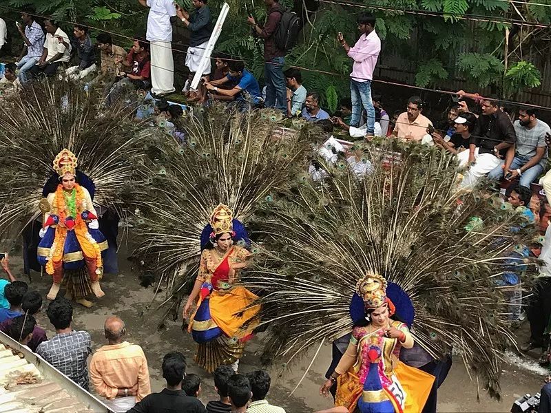 在印度教节日欧南(Onam)上,人们装扮成神明的样子游行,背后装饰着孔雀羽毛丨Ms Sarah Welch / Wikimedia Commons