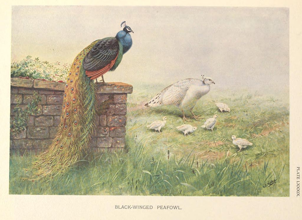 变异色型的孔雀。黑肩的雄孔雀有黑色的翅膀,白色的雌孔雀带着白色的雏鸟丨George Edward Lodge / Wikimedia Commons