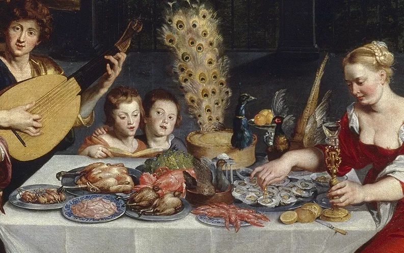 弗兰德画家老扬·勃鲁盖尔(Jan Brueghel the Elder)绘制的宴会菜肴。孔雀被做成了肉馅饼,脑袋和羽毛被保留下来,插在馅饼上作为装饰丨Web Gallery of Art / Wikimedia Commons