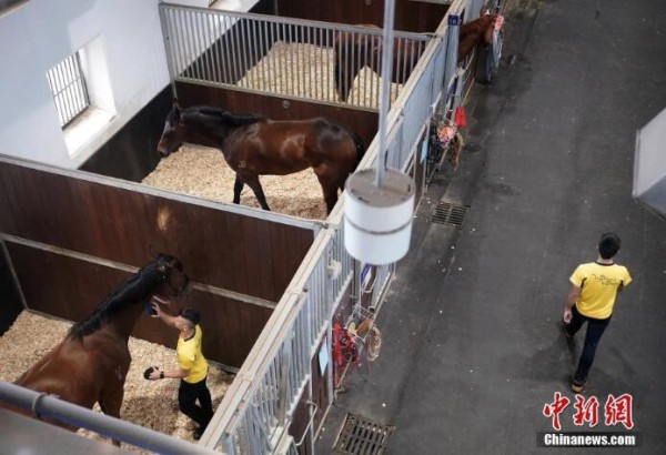 从化马场兴建了11座马房,在中心地段一字排列,当中9座分配给现役赛马使用,11座马房能同时容纳超过660匹马。图为马匹训练结束准备回到马房。