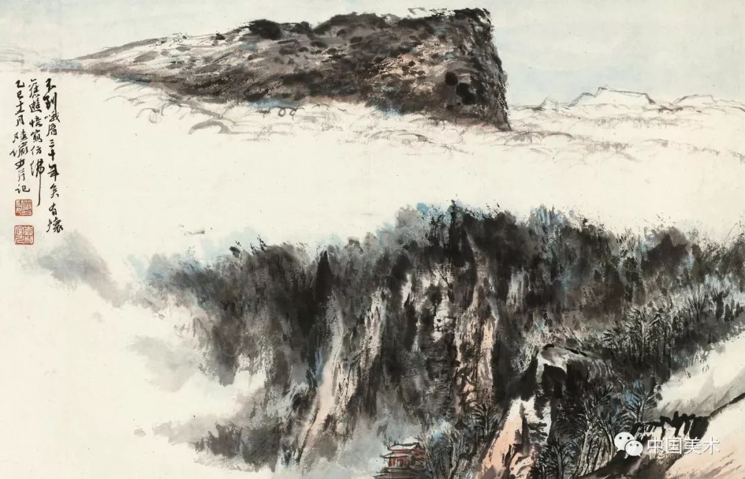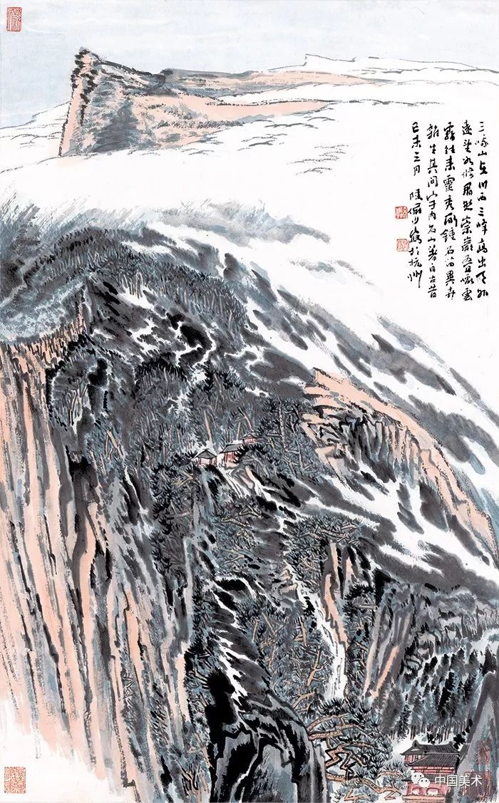 前在雁荡,每夜雨初霁,晨曦欲上,宿云半岭,悬瀑千山,胜地难忘,图以记之。