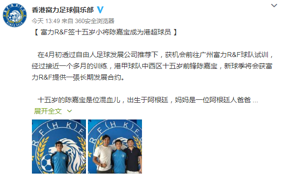 北京时间5月21日,香港富力足球俱乐部官方宣布,球队签下15岁中国阿根廷混血前锋陈嘉宝。