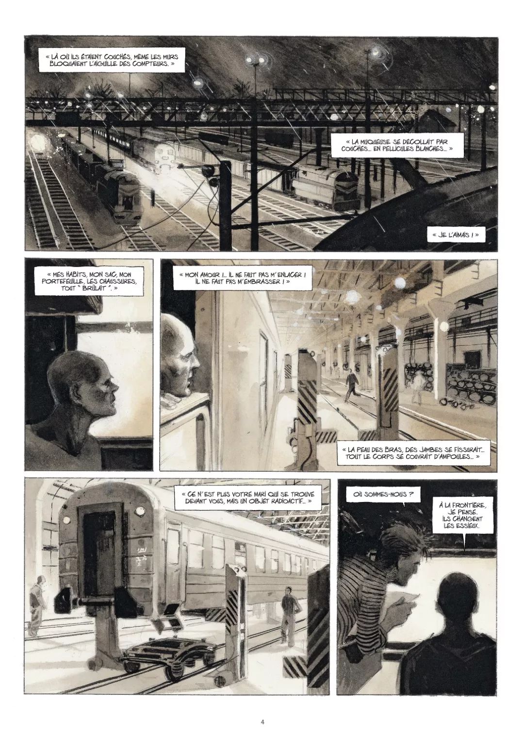 在漫画的前半部分,画面中全部都是暗色调的画风,使得他的画面呈现出一股死气沉沉的恐怖和令人窒息的末世感,画面也大多以随意的线条为主,并没有精细的刻画,这一方面来源于他对切尔诺贝利先入为主的恐惧、手指痉挛症的发作,而另一方面则是由于受制于辐射警报的时间限制——不能停留太久、核辐射警报器一旦鸣叫就立刻离开,在勒巴热的笔下,切尔诺贝利被还原为一个了无生气的死亡空城。