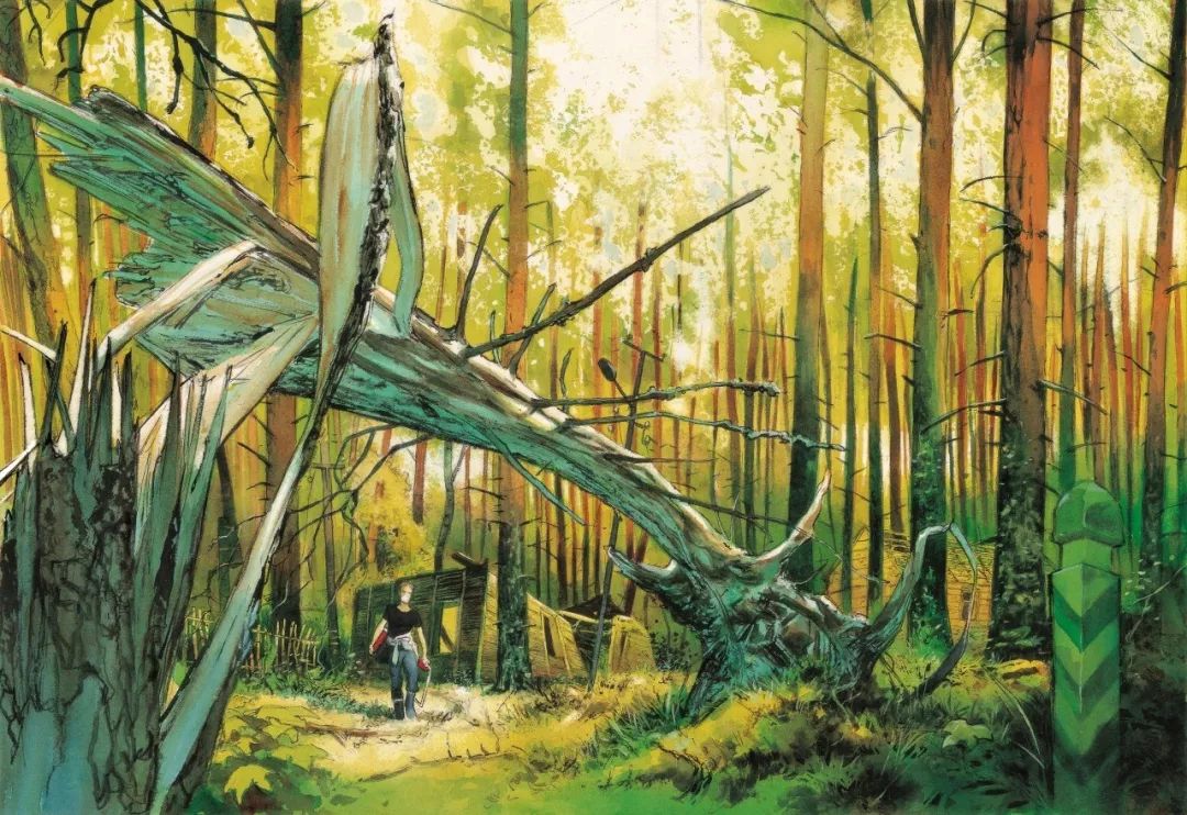因此,最初在勒巴热的画笔下,切尔诺贝利充满了荒凉的末世感——巨大的苏维埃标国徽镰刀和锤子悬挂在破败的大楼上、废置的游乐园的摩天轮仿佛定格在时间中、断头的洋娃娃横躺在空无一人的马路上……