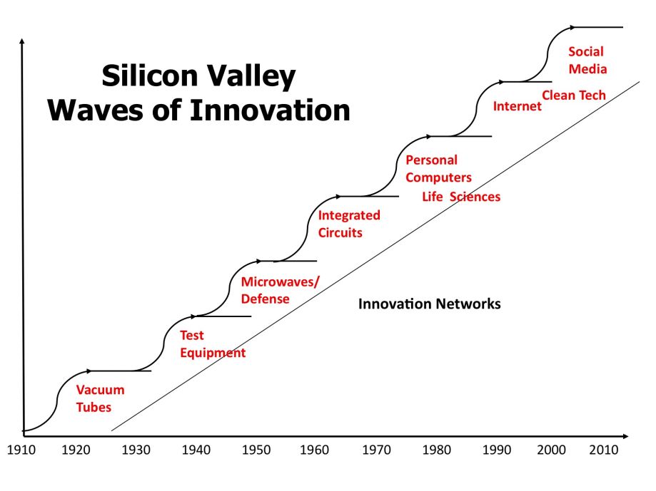 我们看看硅谷的发展历史是怎么样的,在1910年、1920年,做的多数是电子设备测试仪器。而且我们往前时间倒叙2、30年,“硅谷”这个名字来自于半导体行业。还有很多相关的半导体产业都在硅谷,但是从时间轴来看,行业也是不断迭代的,包括当时的真空管,测试仪器,微波集成电路,这些都是不断迭代的。而且现在的行业可能是我们看到的巨头,苹果,谷歌、还有生物科技公司,都是非常新的行业。