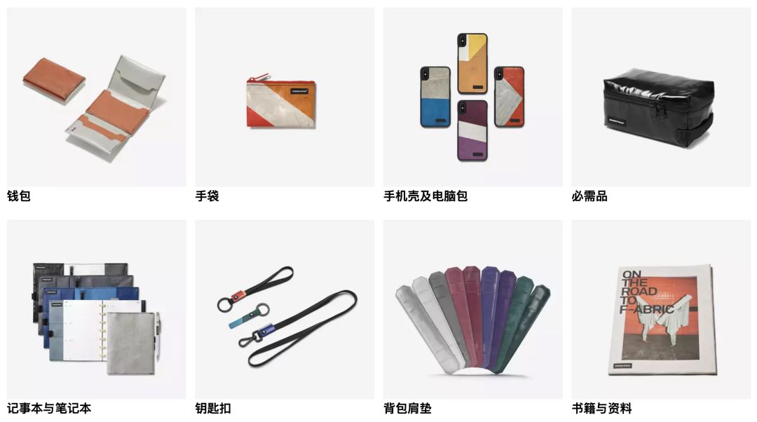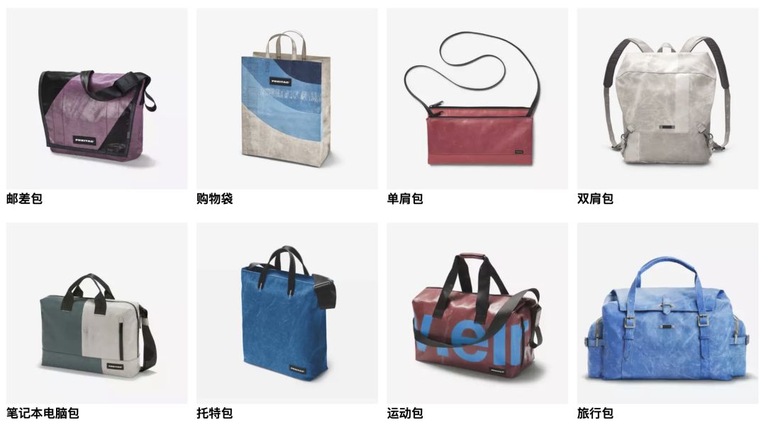 Freitag的产品多种多样,双肩包、斜挎包,单肩包、手拿包,甚至手机套和旅行箱都有,而且很多款型设计都特别巧妙。