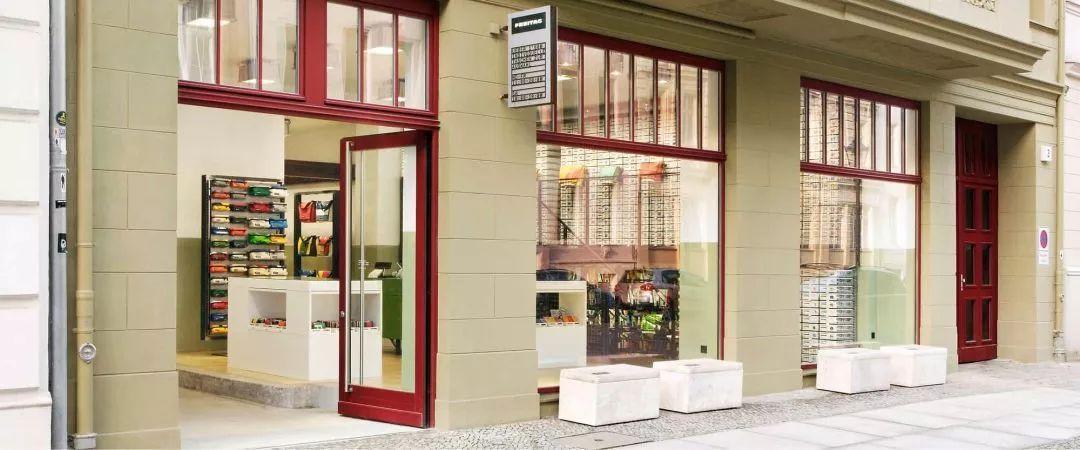 说到购买,Freitag的店铺也值得一提。和材料回收包袋的沧桑过往不同,Freitag店铺简单干净,充满美感,低调的工业风是品牌一以贯之的设计感。因为追随者众多且品牌先行,所以Freitag的店往往开在后街不那么热门地方。
