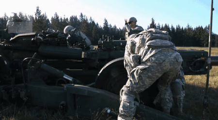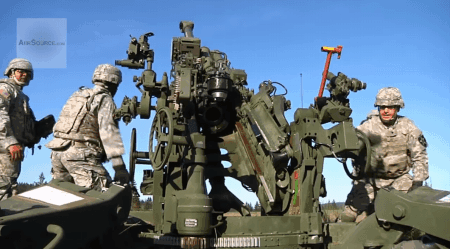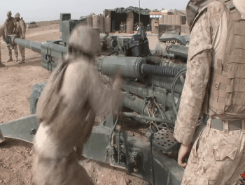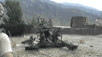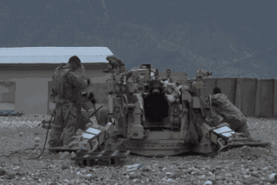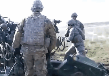 ▲M777的两名炮手协同摇起身管,嘿嘿,加油!