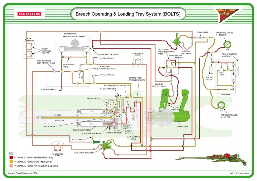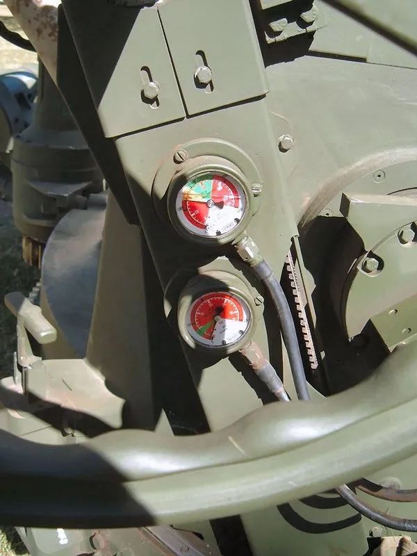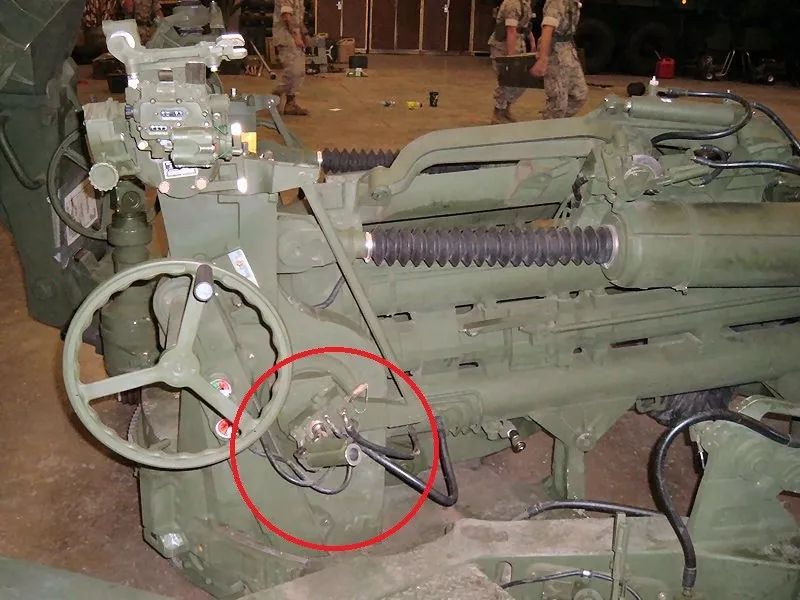 另一套是液压储能系统位于火炮上架的右侧,通过炮手使用人工摇动手柄,完成液压储能装置的“加压”,储能后的能量用于驱动炮闩的液压开关闩系统和托弹盘的伸缩臂液压缸。在战斗状态时,炮手需要随时观察压力表的情况,间歇进行手动加压,否则无法完成开关闩和操纵伸缩托弹盘。这两套系统都需要耗费炮手大量的体力,这对于高海拔地区作战使用是个很大的问题,高海拔地区炮手体力消耗非常大,炮手能否顺利持续操作令人担忧,联想到印度军队新采购了M777用于山地作战,这家伙能行?