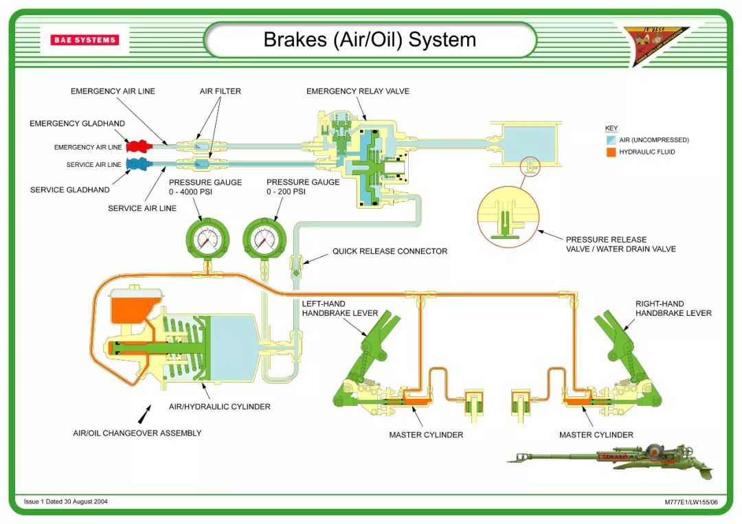 为便于火炮的阵地操作,M777配备了两套液压系统。一套是悬架液压系统,另一套是液压储能系统。悬架液压系统由位于左右两侧的两个前稳定支架的手动液压泵和液压动作筒组成,在从M777战斗状态进入行军状态时(放列时),需要炮手人工摇动左右两侧的液压泵,驱动液压筒的液压杆伸出,此时液压杆推动炮轮摆臂向下,会慢慢顶起炮架,这个液压筒就作为“千斤顶”使用,当液压杆完全伸出后,处于行军状态时,液压筒和炮轮摆臂通过调整压力阻尼后兼做炮轮的液压悬架系统,在M777做行军战斗转换时(撤收时),释放液压系统压力即可落下火炮,但仍需人工抬起收拢炮轮。