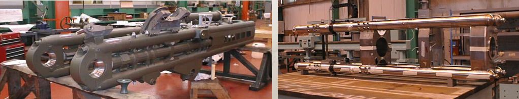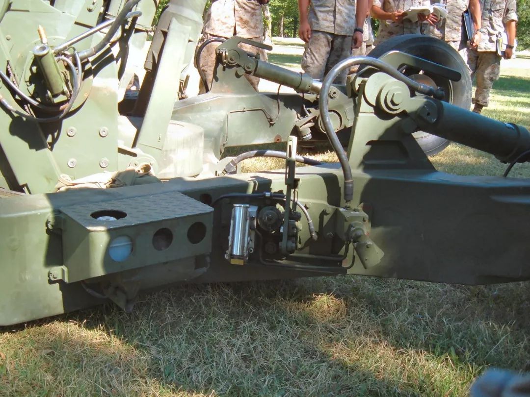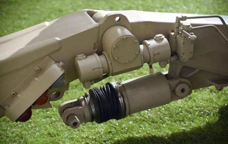 ▲M777左右前稳定支架上安装的悬架液压系统,银色部分为摇杆座