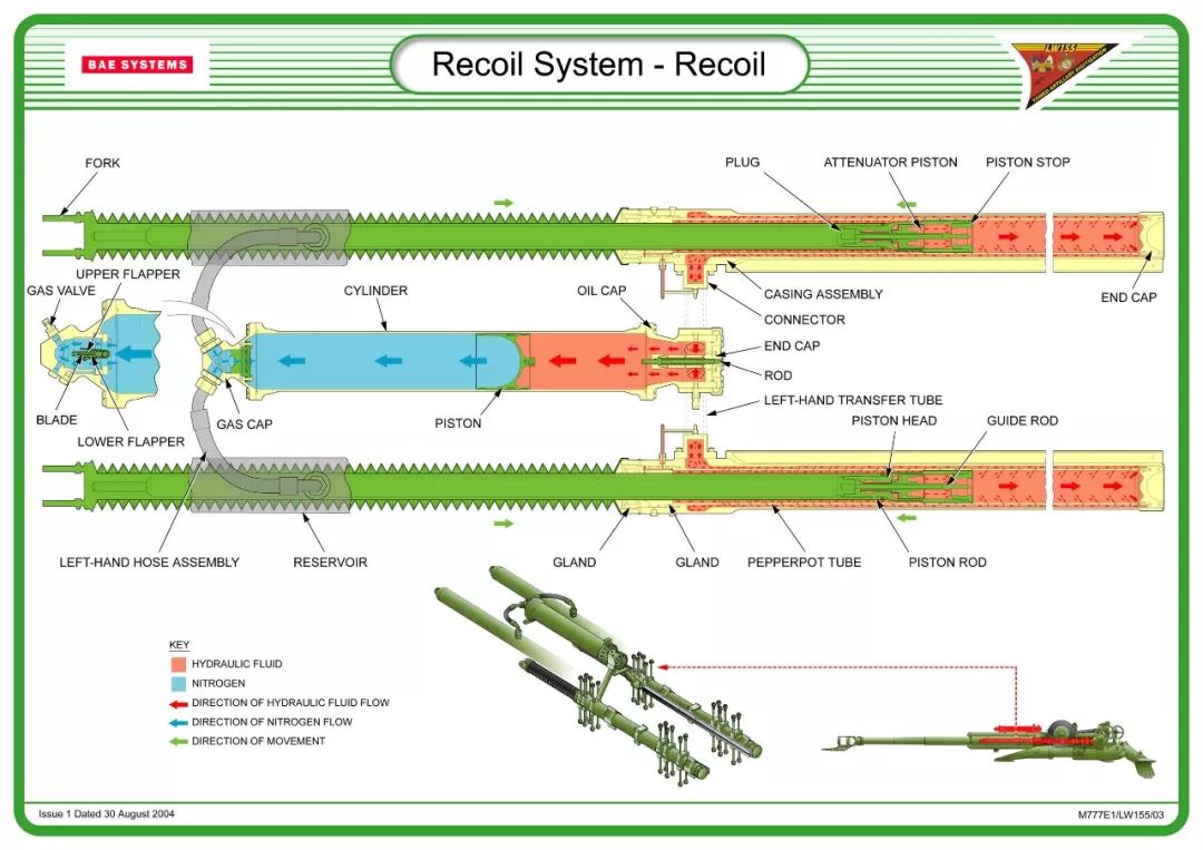 M777的摇架由4根钛合金管焊接连接而成,这四根钛合金管体即是摇架体又是反后坐装置的一个组成部分。M777的反后坐装置与传统火炮的反后坐装置有很大区别,它是在两侧钛合金管的中间各设置了一根后坐筒,当火炮发射时炮身中部的卡箍带动后坐筒中的后坐杆向后运动,后坐杆后端的活塞开始压缩筒内的驻退液体,驻退液进而压缩驻退气体通过管路进入摇架上部的一个气体蓄能筒并最终进入钛合金管的上半部分空间进行蓄能,在后坐终了后再从蓄能筒释放能量完成火炮的复进,这种结构具有后坐制动及复进两种功能,后坐距离为1.4m。M777的这种反后坐装置看似新颖,但结构非常复杂,加工起来对工艺的要求很高,而且后期维护起来也是相当的麻烦。