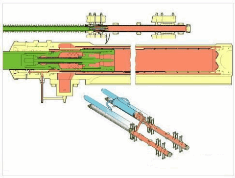 相对来说,AH-4就要简单的多,它仍采用传统的反后坐装置,反后坐装置的“双机”对称布置于摇架的上下侧,液体气压式复进机在上,带沟槽式复进节制器的制退机在下,炮身安装在两摇架臂中间位置用铜衬瓦相配合并可进行滑动,“双机”的节制杆分别连接于后面的炮闩上下,这样的反后坐装置技术已非常的成熟,制造简单、造价低而且性能非常的可靠,维护也很便捷,它的极限后坐长为1.45m。AH-4的摇架和反后坐装置(驻退机和复进机)设计为一体,摇架与反后坐装置的外筒连在一起,也增强了摇架的结构强度。