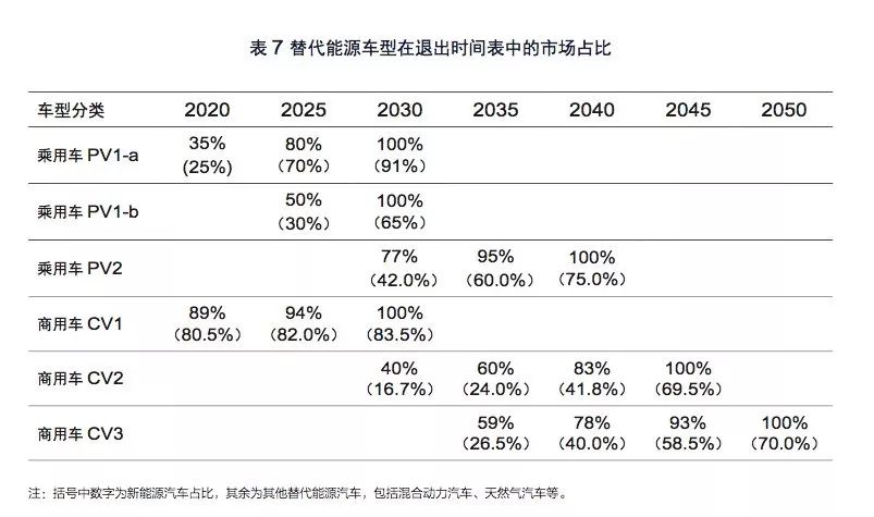 至于这一退出节奏的设置,报告称,依据了先松后紧的原则,2020-2030 年的节能与新能源汽车目标基于国家目标设定,而2031-2050 年则基于汽车石油消耗总量在 2040 年和 2050 年分别较峰值下降 55% 和 80% 来确定,进行自洽拟合。“在未来情景基础上对各类车型替代技术发展与应用进行预判,提出传统燃油汽车退出时间表”。