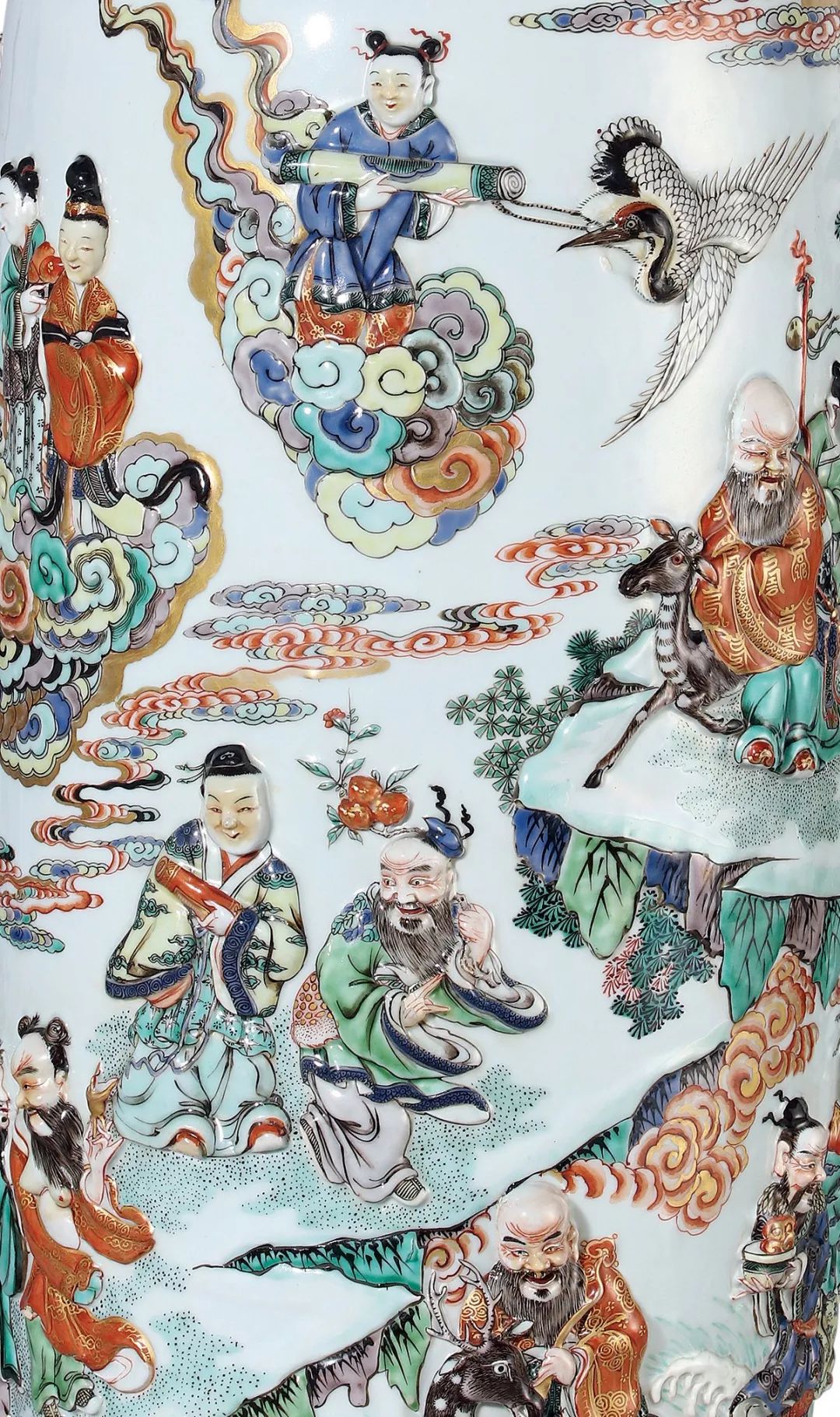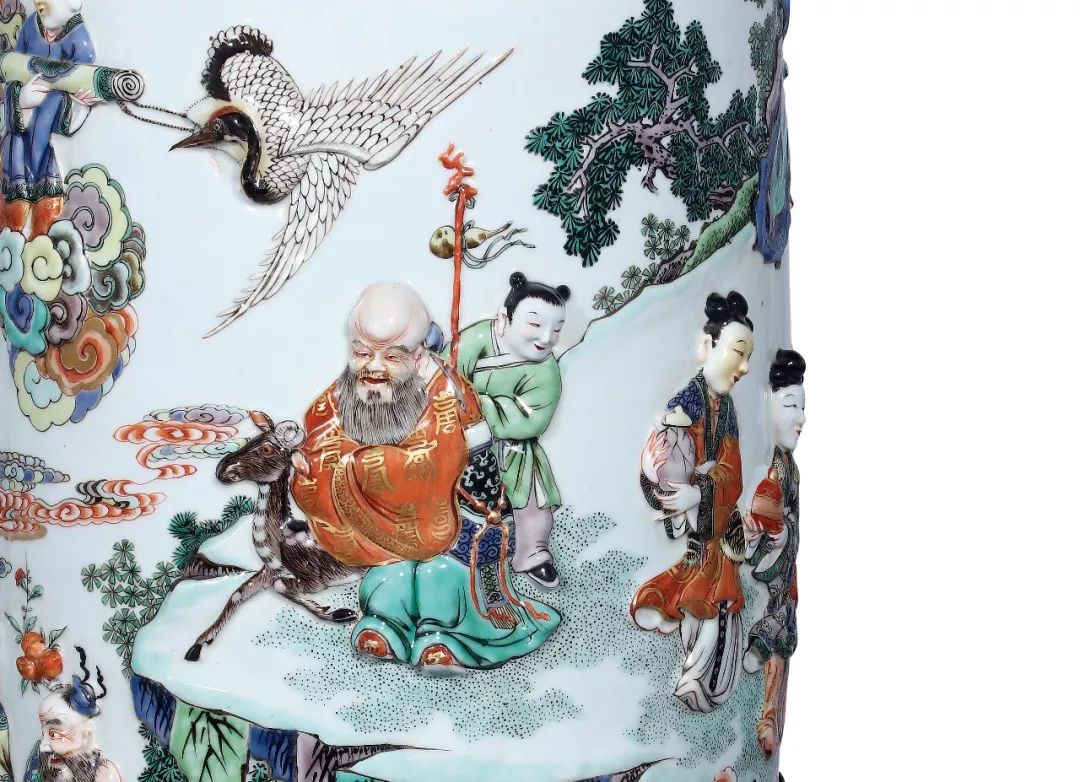 瓶身以五彩装饰为基础,采用通景式构图方法,纹样富丽,着色丰富,令人叹为观止。口沿绘饰一周回纹,肩部饰四开光,内绘风景人物图;颈部及腹部所取纹样为传统的群仙庆寿图,与传统的五彩装饰不同,本品之山石、人物、松木皆以堆塑装饰,颈部堆塑五位仙人,一人执扇而立,四人姿态各异,持卷观水火匡廓图,另塑一仙鹤望日而舞。