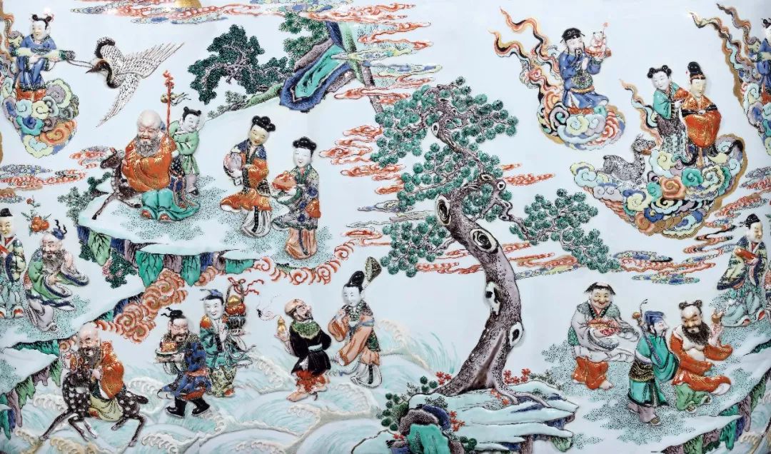 此瓶腹部堆塑十八位神仙人物,与传统的八仙庆寿不同,因本品体积硕大,可呈现空间更为宽广,故除传统八仙外,更有自明代话本发展而来的上八仙、中八仙与下八仙中的祥瑞人物。整体画面以南山不老松为起始,以笑容可掬的骑羊寿星为主,瑞云之上为送子张仙,献寿麻姑,童子在仙鹤的引领下捧仙召徐徐而来。踏浪而来的为骑鹿的禄星,旁侧分列曹国舅、蓝采和、铁拐李及何仙姑;地面之上东方朔扛桃枝神态俏皮,身后韩湘子手捧金卷寓意金榜题名。身侧为吕洞宾、钟离权、刘海三仙。