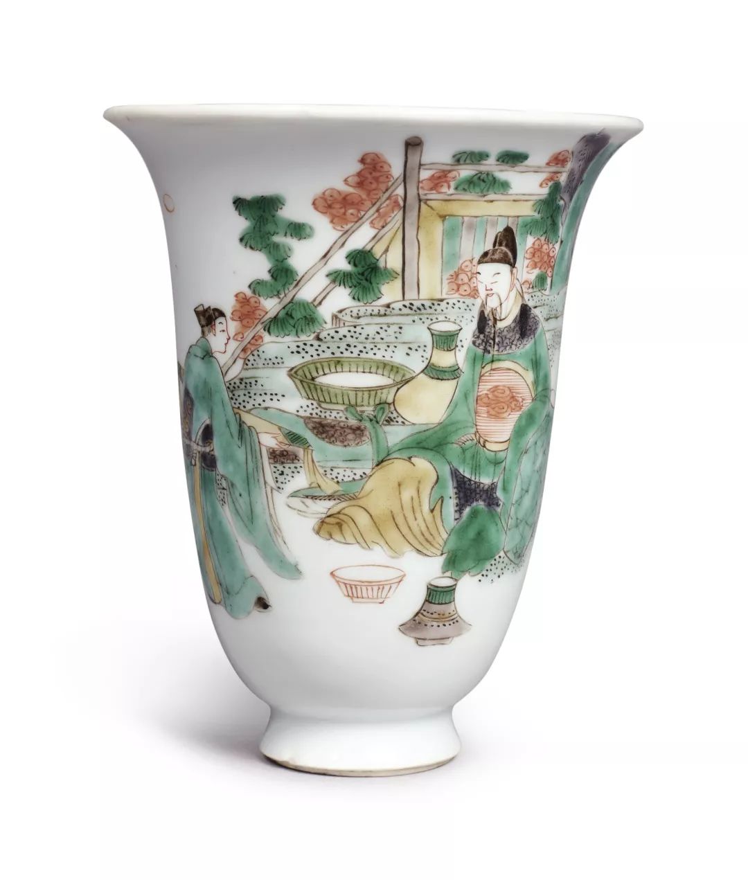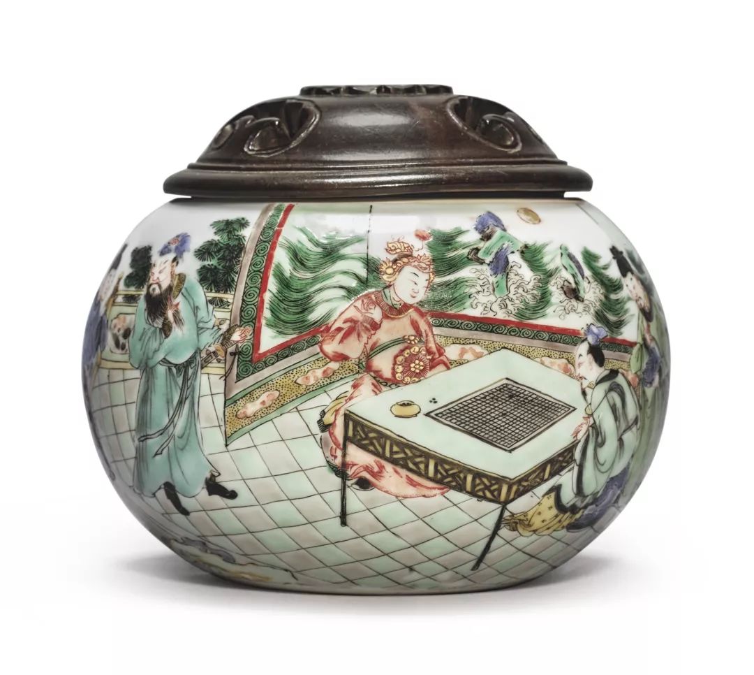 康熙五彩冠绝天下,可谓正逢其时,康熙帝为维护政权的长治久安,注重学习和采纳汉文化;在此基础上,明末繁荣发展的版画深刻影响了康熙瓷的装饰选题。当时十分有名的版画中心有金陵,杭州、徽州和苏州等地,而景德镇正处于与徽州交界处,近邻金陵、苏杭,绝好的地理位置为版画与陶瓷的结合提供了便利,许之衡《饮流斋说辞》中有:『人物故事标新立异,波澜推行,穷极诙诡,大抵皆导源于小说,然皆与历代丹青画法相结合也。』如本品之群仙祝寿题材,人物的塑造及装饰技法皆可在同时期或略早的戏曲版画中寻得传承轨迹,使其赋予情趣盎然的内涵与奔放洒脱的艺术张力,别具一格,当为妙品。