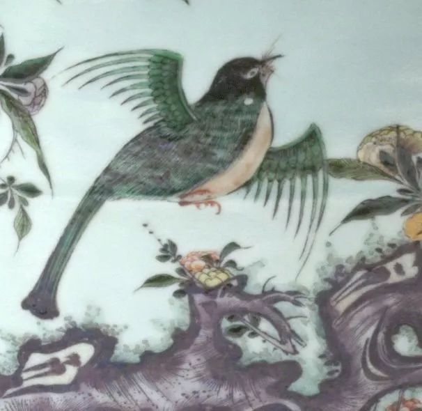(八)花翠(粉红色):这在康熙五彩中是鲜为人知的色彩。它是用紫彩加以配方而制成偏红色的透明釉。它与雍正后出现的粉彩胭脂红或洋红在外观上极其相似,很易混淆。但花翠是雪白(含铅质的透明釉)渗石英配制,显得透明,而粉彩的洋红是玻白(含砷)上渲染红彩而显得不透明,色基上是相同的,但两者的质感截然不同,因此花翠也就成了辨别康熙五彩的点金石。其实雍正初期的五彩器也用花翠,因此花翠很容易被人误认为早期粉彩,而其实雍乾时洋红的出现并引进陶瓷装饰,才真正孕育着粉彩的诞生。