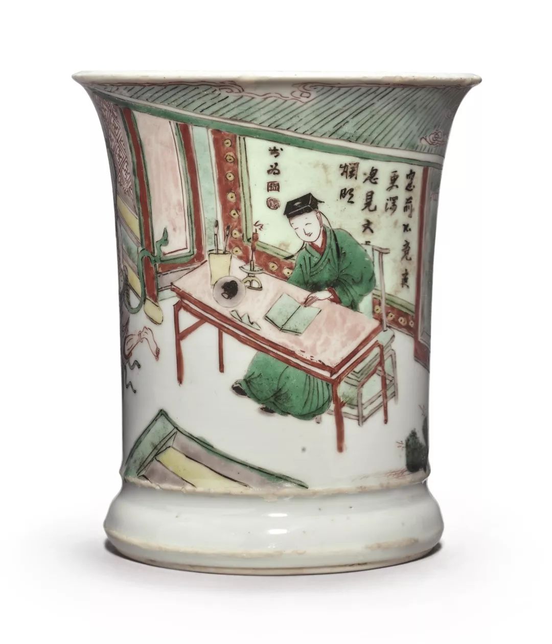 有趣的是我们可从同时期不同器形装饰纹样上,找到同类观卷图,可见大英博物馆藏五彩神仙人物笔筒,馆藏编号PDF.A.842(图一);腹部背景则以迂回转折、起伏变化的山石为中线,天空瑞云层叠,其下波涛汹涌,并以深浅不一绿赭色调的地皮来体现画面的空间感和错落感。