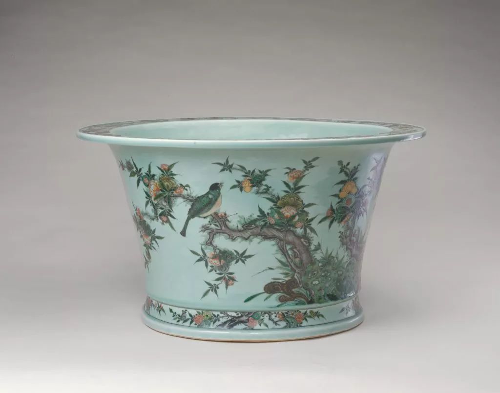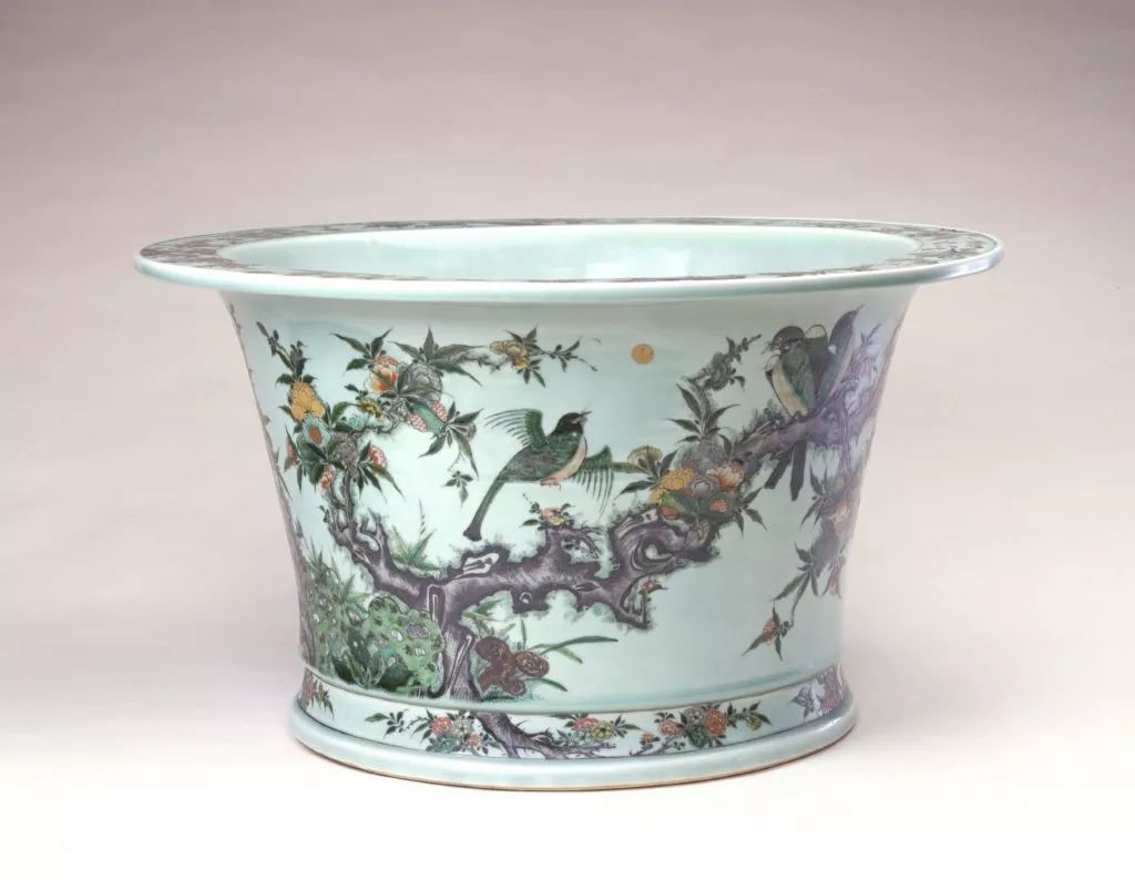 花盆呈圆形,折沿,深腹,撇足,底心有一圆形渗水孔。花盆以冬青釉为地,外壁通体描绘五彩加金花鸟纹饰。