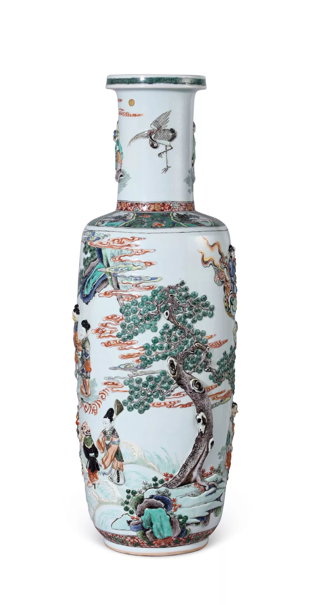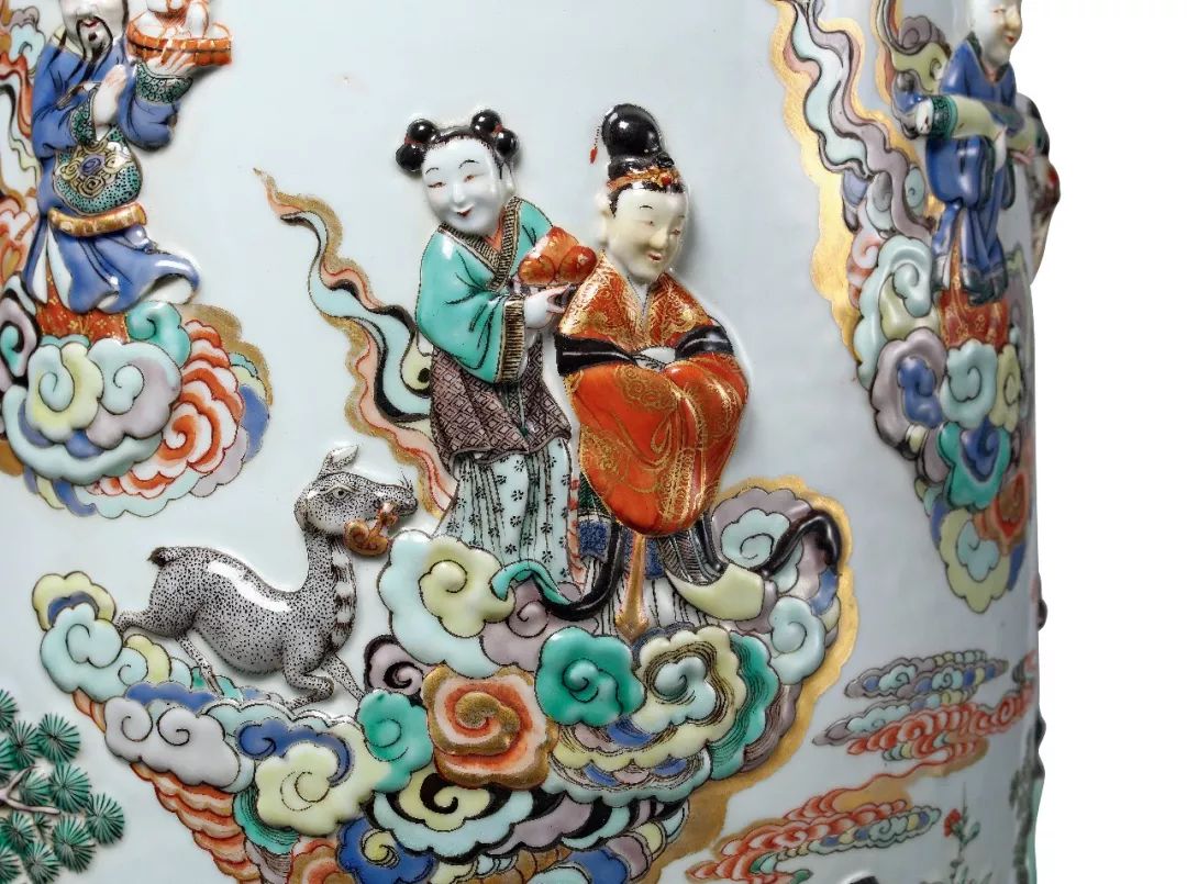 此瓶人物形象诡奇肆意,神态夸张,所绘手法潇洒飘逸,笔触皴染得宜,且人物装饰等皆为堆塑而成,极其难得,而体量如此之巨尚无变形,并且发色上佳,绘工精细,也可证彼时窑工烧造技艺之纯熟。尺寸相近,美国俄亥俄州辛辛那提 TAFT MUSEUM有此类似装饰(图三),亦绘群仙庆寿一例可参见出自John L. Severence收藏,1936年捐赠予克利夫兰艺术博物馆,后售于纽约佳士得2000年9月21日,编号324,现属洁蕊堂收藏;