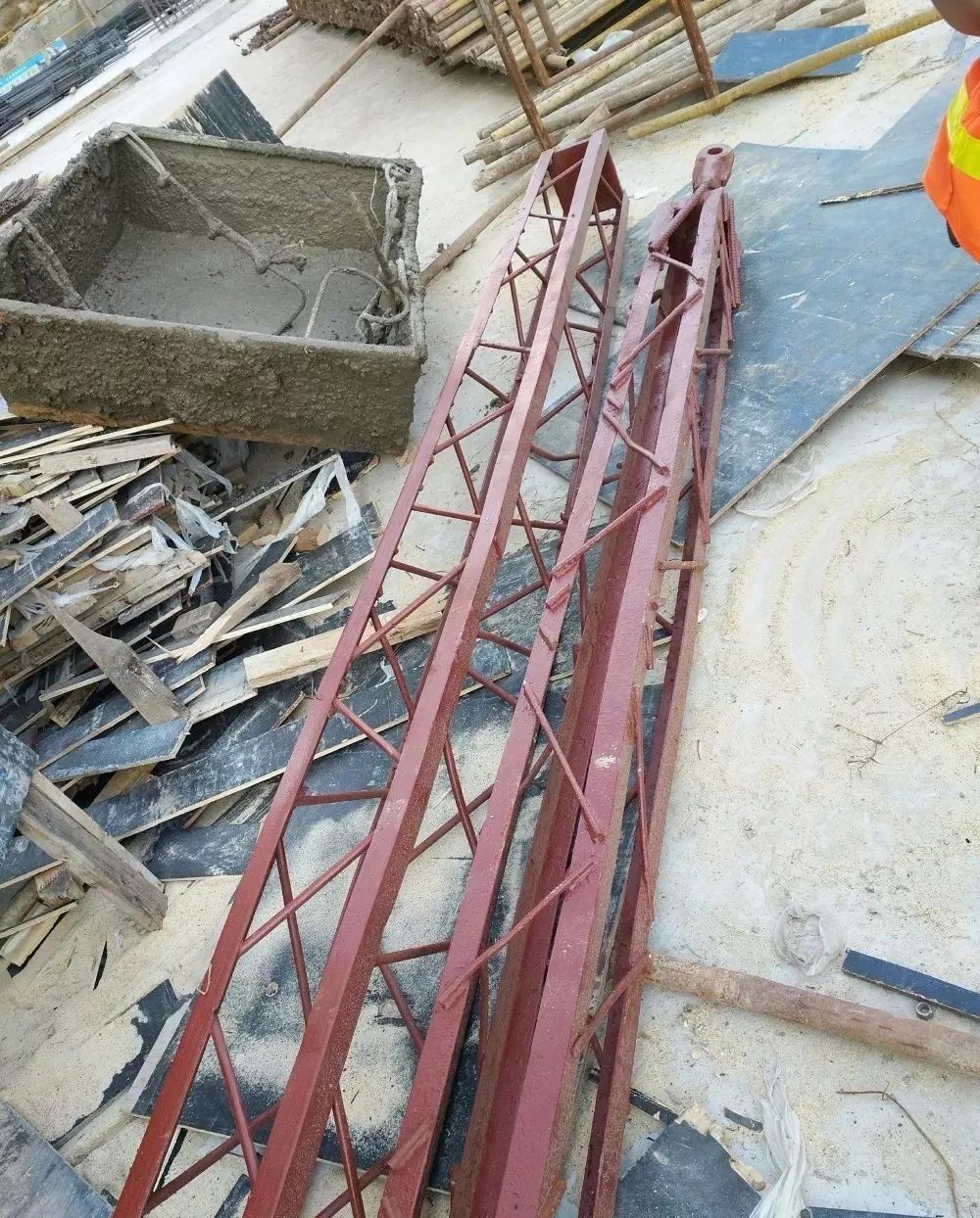 格构附墙,斜撑焊接使用螺纹钢(安装后,第一时间被要求拆除更换),这是因为螺纹钢不易焊接,且材质较脆易崩断。所以用Q235的材质做附着杆较好。