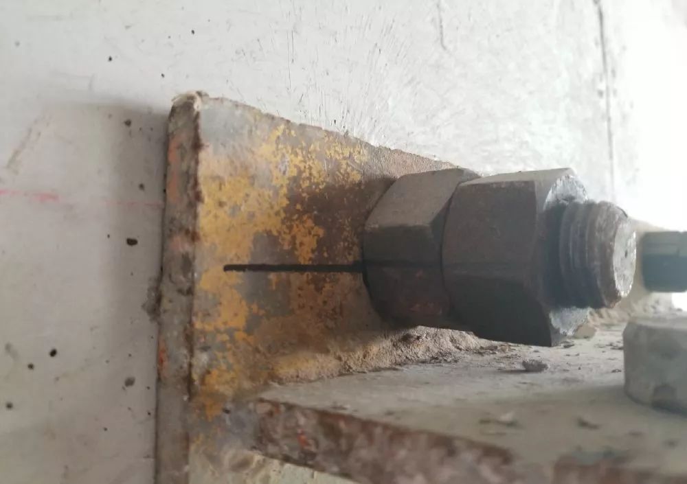 附墙一旦安装完成,日常检查就是确保其安全可靠的有效措施。下面这种划线可视化检查方法可以推广,‘’大图特写(螺栓若松动,划线断开)