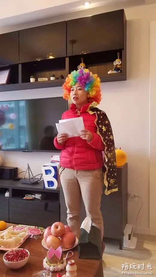 到了扮小丑环节,直男老公看到毛茸茸的头套临阵脱逃,我只能自己顶上。一边当主持人,一边招待她们,整个人精分。当时就想着,幼儿园老师真是太不容易了。