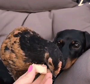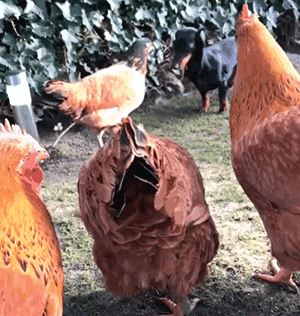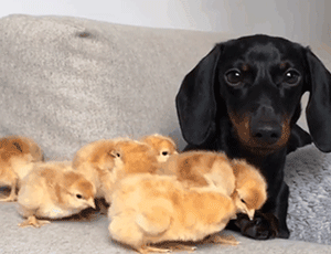 由于天天和鸡相处,Loulou身上自带母鸡光环,导致一群小鸡把它认成妈妈,天天跟着它。
