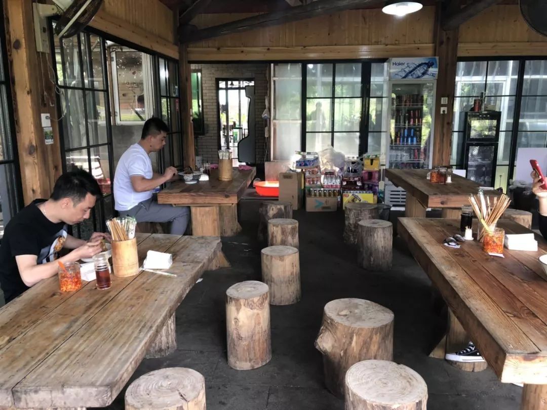 为什么文艺人士都吹爆小辫子?有原因的,人家环境无敌啊,后院就是整片茶园,桌子是整张实木条桌,摆放极其霸气,不像面店,倒像茶室。