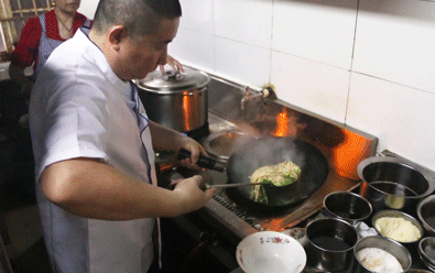 来翠是标准的开放式厨房,灶台靠近马路,大厨腰杆笔挺,双手不停,猪肝腰花一把撒下去翻炒,锅里腾起火焰,哗啦哗啦,浇头炒出来,再一把面放下去,手腕一倒。