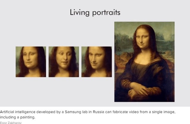 据外媒报道,俄罗斯三星实验室开发的人工智能技术Deepfake AI,让你可以用一张照片,就能制作出视频剪辑,甚至连“仿真”蒙娜丽莎画像也能“以假乱真”。
