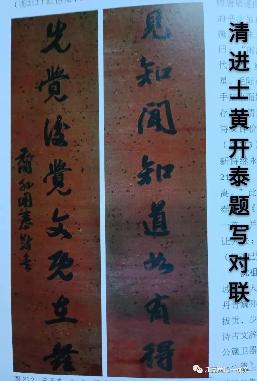 黄开泰不仅是一位诗人,也是一位书法家。他曾书写一行对联:“见知闻知道如有得,先觉后觉文既在兹。”落款裔孙开泰敬书。此对联旧时收藏在黄氏家庙,后来流落民间,被新加坡华侨购买去收藏。