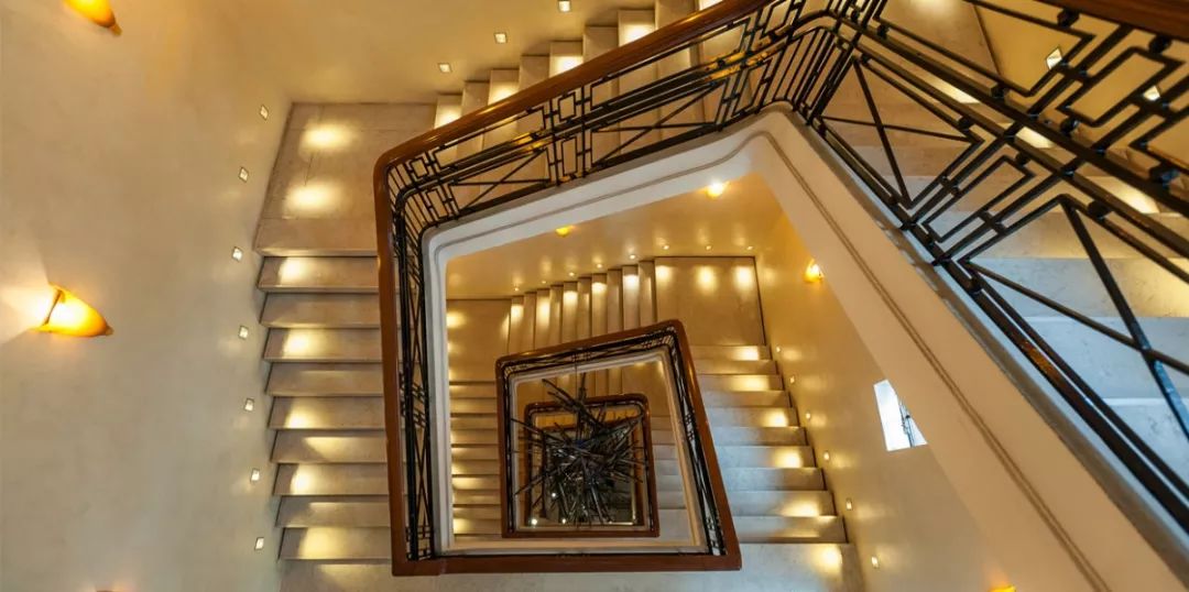 走进大门后右转,就是旋转楼梯。暖色的光晕让方形的旋转楼梯有了柔和的温度,方形的旋转给与震撼的视觉冲击,从上往下拍摄,位于底部的楼梯中央,是折叠摆放的上海老自行车艺术品,不规则又富有艺术感,如同盛开的一朵花。