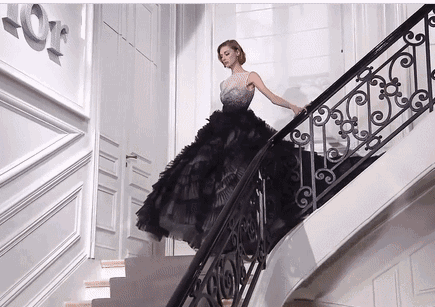 行走楼梯上、侧身回眸、随意而坐
